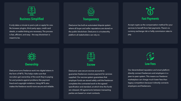 DeeLance เป็นตลาดการจ้างงานมาใหม่ที่ธุรกิจและฟรีแลนซ์สามารถทำงานร่วมกันได้ ซึ่งเป็นตลาด Blockchain ที่มีจุดเด่นเหนือแพลตฟอร์มฟรีแลนซ์ในปัจจุบัน รวมถึงการชำระเงินด้วยเหรียญคริปโต ระบบระงับข้อพิพาทอัตโนมัติ และอื่นๆ
